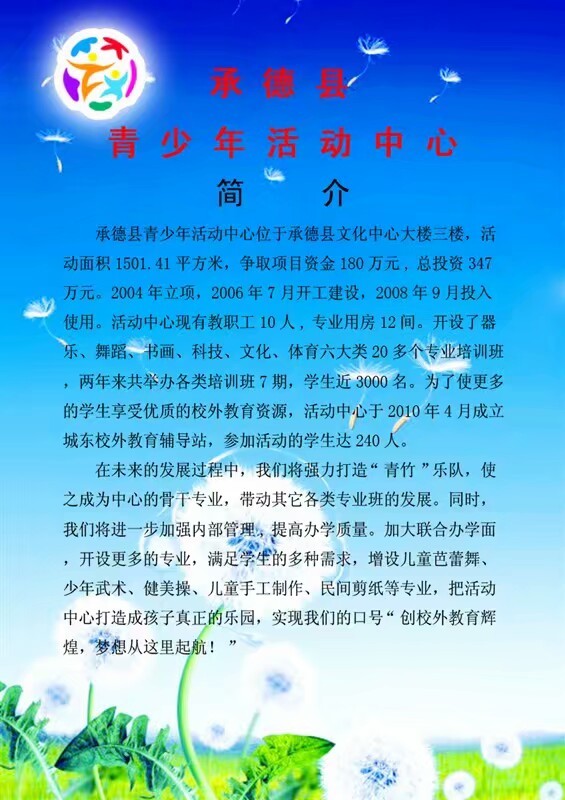 承德县青少年活动中心位于承德县文化中心大楼三楼,活动面积1501.41平方米,争取项目资金180万元,总投资347万元。2004年立项,2006年7月开工建设,2008年9月投入使用。活动中心现有教职工10人,专业用房12间。开设了器乐、舞蹈、书画、科技、文化、体育六大类20多个专业培训班,两年来共举办各类培训班7期,学生近3000名,为了使更多的学生享受优质的校外教育资源,活动中心于2010年4月成立城东校外教育辅导站,参加活动的学生达240人。