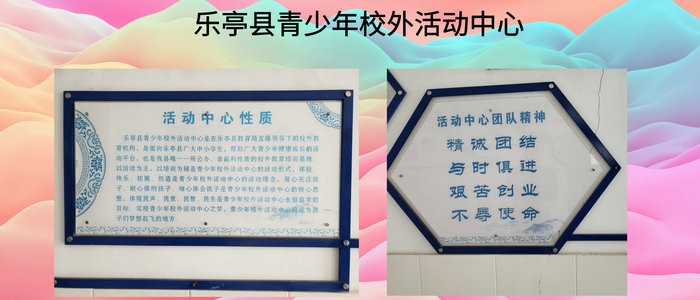 乐亭县青少年活动中心位于茂源街与润泽路交叉口,建成于2011年,占地面积6707平方米,建筑面积2609平方米。楼内设有道德讲堂、音乐、体育、美术、科技、心理咨询、茶艺等16 间活动室。