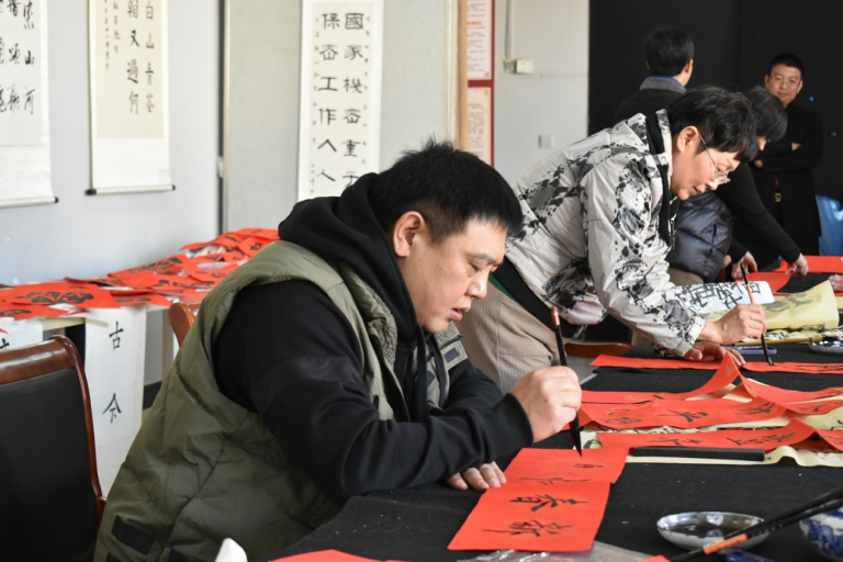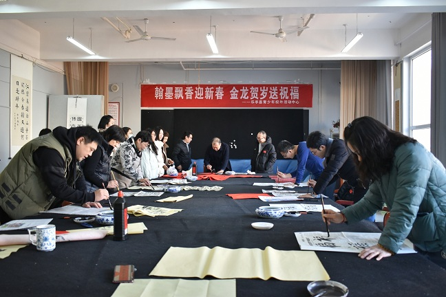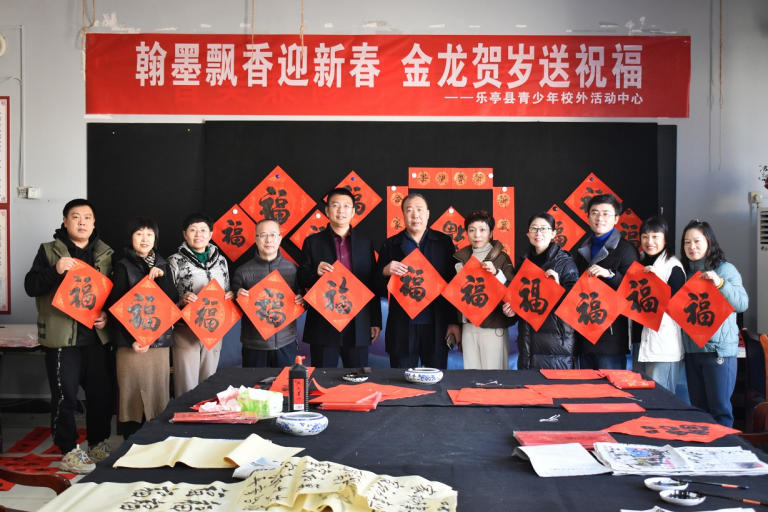 贴春联是我国春节的传统习俗之一。在辞旧迎新之际,为弘扬中华优秀传统文化,营造欢乐祥和的节日氛围,1月15日,乐亭县青少年校外活动中心举办了“翰墨飘香迎新春 金龙贺岁送祝福”迎新春写春联活动。县教育局党组成员、副局长郑海波,办公室(党办)主任张维和,体卫艺科科长王强,副科长薛小卫受邀出席活动,中心书法社团成员参加了活动。