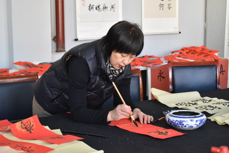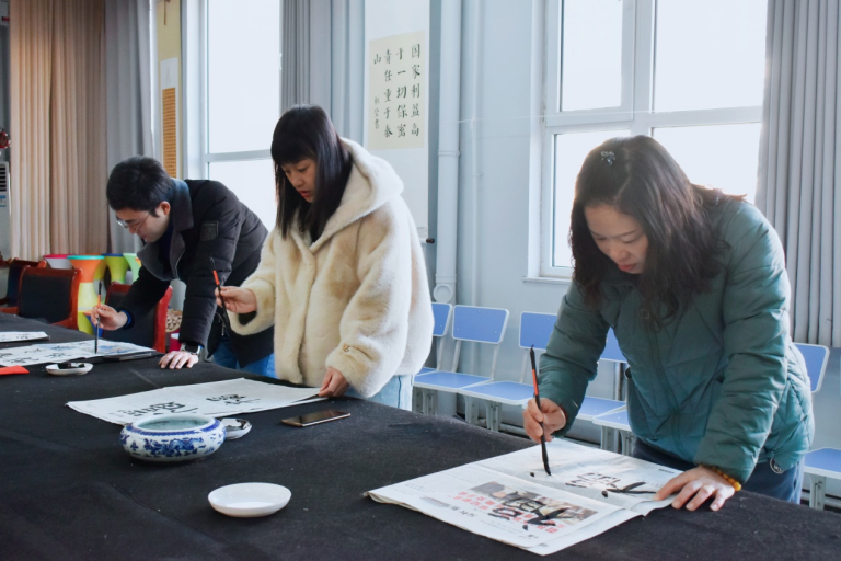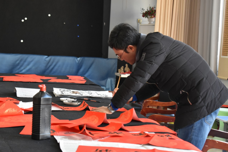 王强带领老师们现场挥毫泼墨,尽显风采,活动气氛热烈。行云流水的草书,清新飘逸的行书,端庄秀雅的楷书,一幅幅饱含墨香的春联满载着绵绵的祝福,一张张大红的福字洋溢着浓浓的年味儿,这一笔一划间抒发着大家对新一年的无限憧憬……