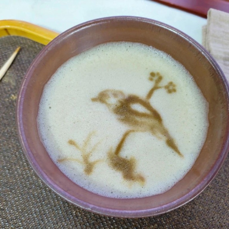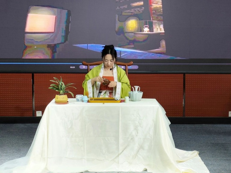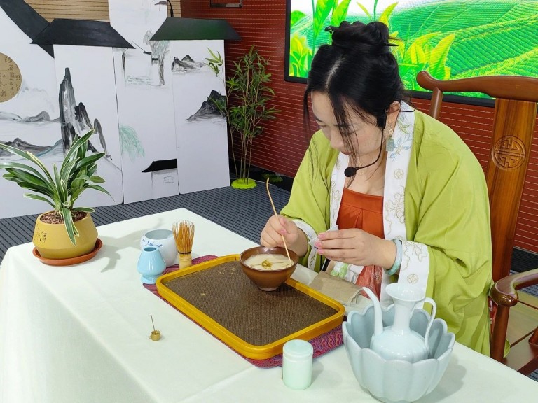 宋代点茶体现了宋人对精致生活的追求和对自然之美的敬畏,在点茶的过程中,每一个步骤都需精心操作,高级茶艺师赵迎艺老师通过提壶注汤,一次次的运筅击拂,茶汤的沫勃越来越多,越来越厚密,随之汤沫变得绵白、洁软,如云雪般浮于盏中,调膏作画,一副栩栩如生的花鸟茶画展现出来。